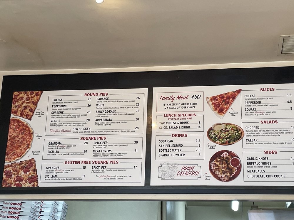 Thick crust square pie crust, Mozzarella, ricotta, basil pesto, Grandma tomato Sauce. *Please note: The Square Pie has a thicker crust and takes longer to prepare.